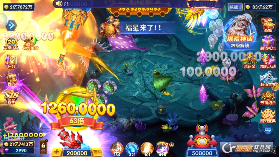 核心玩法围绕捕鱼竞技展开,收录上百种鱼类和特色BOSS,从普通小鱼到深海巨鲲、黄金龙鱼等高分值目标应有尽有。不同鱼种对应不同捕获难度和奖励倍数,BOSS定时刷新且爆率可观,击倒后能触发全屏爆金特效,收益直接翻倍。