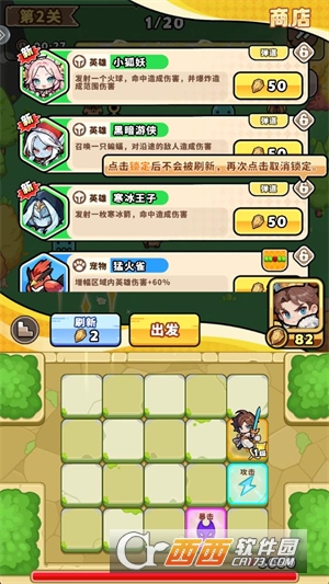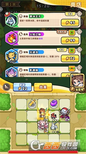 4、消灭怪物可以获得经验和宝石,提升等级后可以进入商店选择新的英雄、道具和宠物来增强自己。
