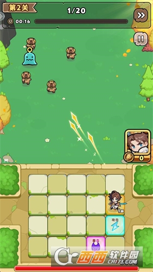 棋盘式塔防布局,需在格子上合理摆放英雄与宠物,兼顾射程、技能联动和宠物 Buff 覆盖范围。每个关卡的敌人波次(如第 10 关共 20 波)和路线不同,需动态调整站位,利用地形优势阻挡敌人,搭配穿透、范围伤害类技能应对密集波次。