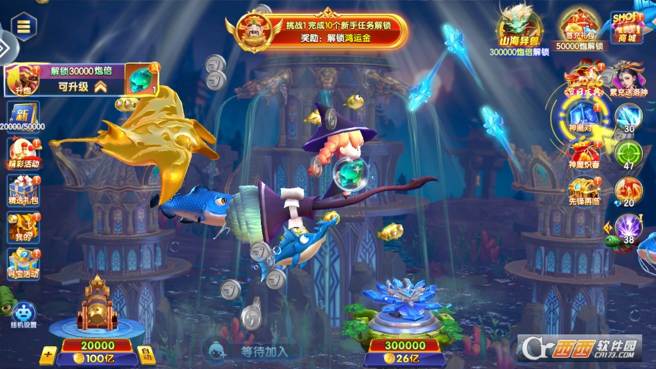 4. 策略与社交兼顾,支持真人联机、联盟组队与私人房间对战,战斗中可运用反弹、鱼潮把控等技巧提升收益。炮台升星与属性搭配系统,让养成与操作需求双重满足。