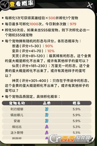3、孵化机(抽卡)只能抽到普通和变异两种形态的宠物,前期可以适当抽取变异SSS宠物,资质最高。后期只需要用获取的免费抽卡券抽即可。
