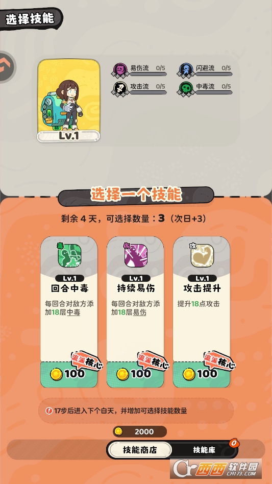 2. 流派技能搭配玩法,每局可随机获取技能,通过组合不同技能形成专属流派,部分技能可合成进阶效果,大幅提升战力。技能商店每日有三次金币购买技能的机会,未购买的技能可保留至次日,流派达到3星还能获得金币奖励与步数加成,策略搭配直接决定闯关效率。