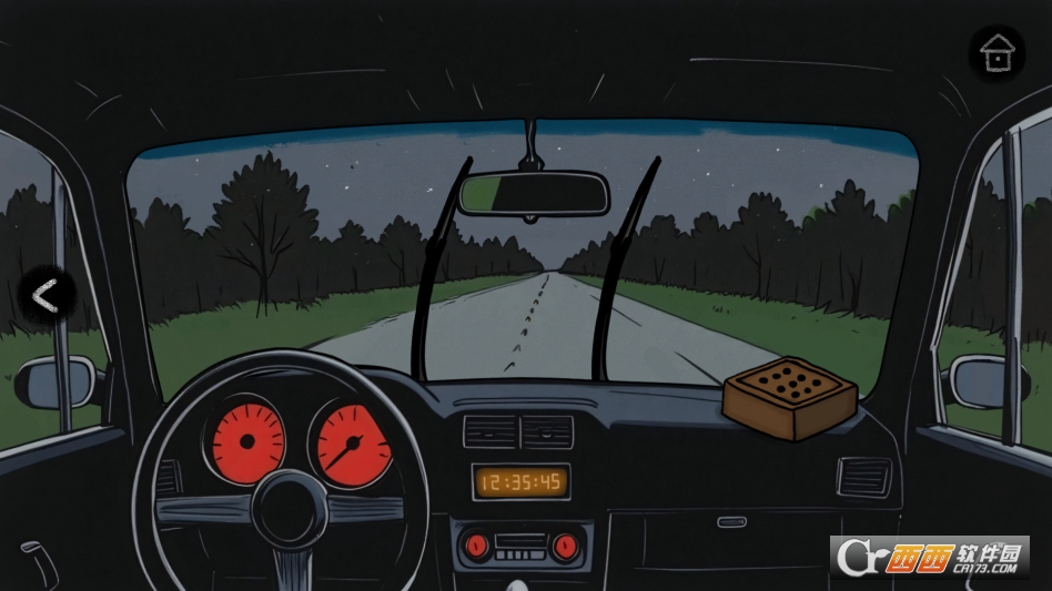 车上时间12:35:45.车上有笑脸盒,离开车,路上捡木棍。