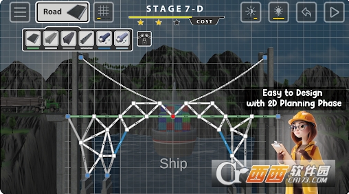 材料与结构搭建:玩家可使用木材、钢材、钢缆、液压活塞等多种材料,通过拖拽操作连接节点,构建梁式桥、悬索桥、液压开合桥等结构;需结合材料特性(如木材便宜但脆弱、钢材坚固但昂贵)设计桥梁,同时利用三角形桁架等稳定结构增强承重能力。