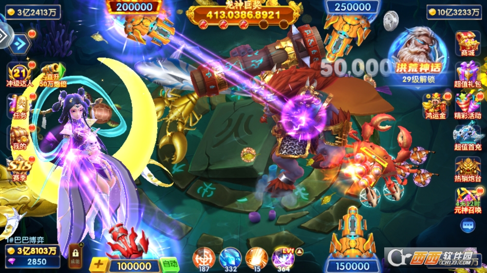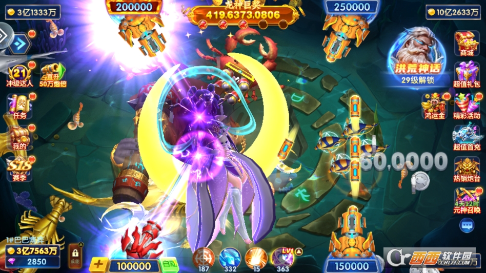 4. 千炮万炮解锁玩法,炮台倍率可循序渐进解锁,从基础倍率逐步升级到千炮、万炮,倍率越高,炮弹威力越大,爆机概率和下分速度也越高,不用氪金,完成日常任务就能快速解锁高倍炮台。