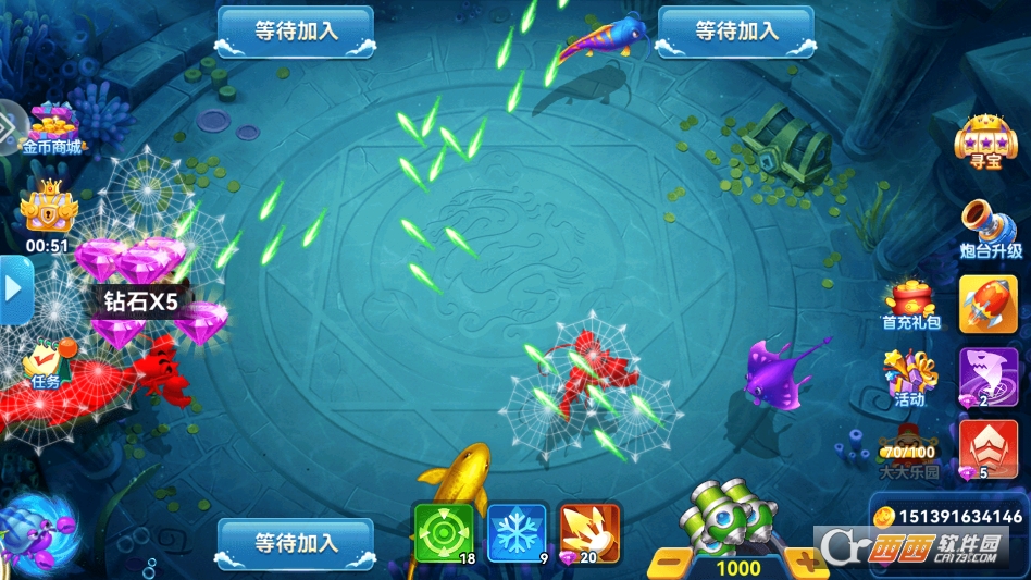 1. 核心捕鱼玩法,玩家操控炮台在海底捕鱼,滑动屏幕调节炮台方向和角度,点击屏幕发射炮弹,捕获鱼群就能获得金币和对应奖励,不同鱼群的分值和捕获难度不同,高分鱼群需要更强力的炮台才能轻松捕获。