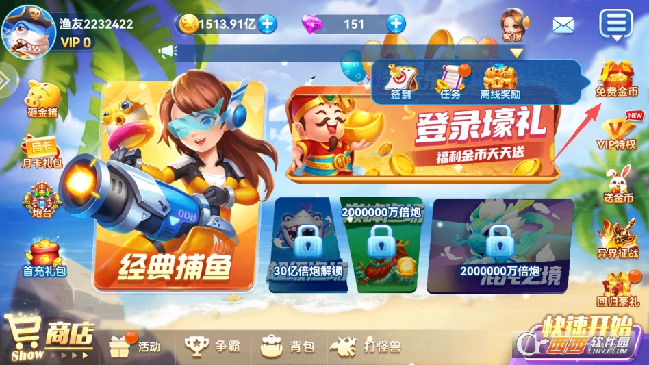 2. VIP专属捕鱼玩法,登录就送VIP,解锁专属高倍炮台和特色道具,VIP等级越高,福利越多,不仅有专属金币加成,还能进入VIP专属场馆,场馆内爆机概率更高、奖励更丰厚。