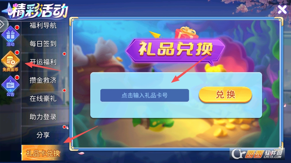 在左侧免费金币版块中,找到下方的礼品码兑换按钮即可兑换