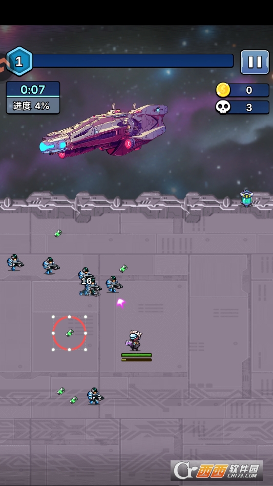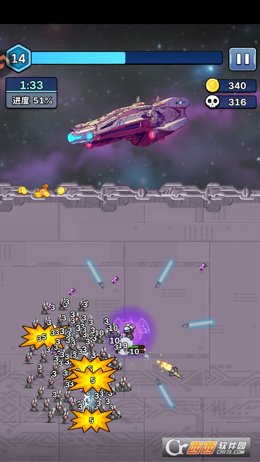 核心玩法是肉鸽割草闯关,玩家操控选择好的角色,前往各个星际星球挑战,每一关都有大量外星怪物,包括布雷车、金甲虫等特色怪物,角色自动攻击怪物,玩家只需操控角色移动闪避即可。