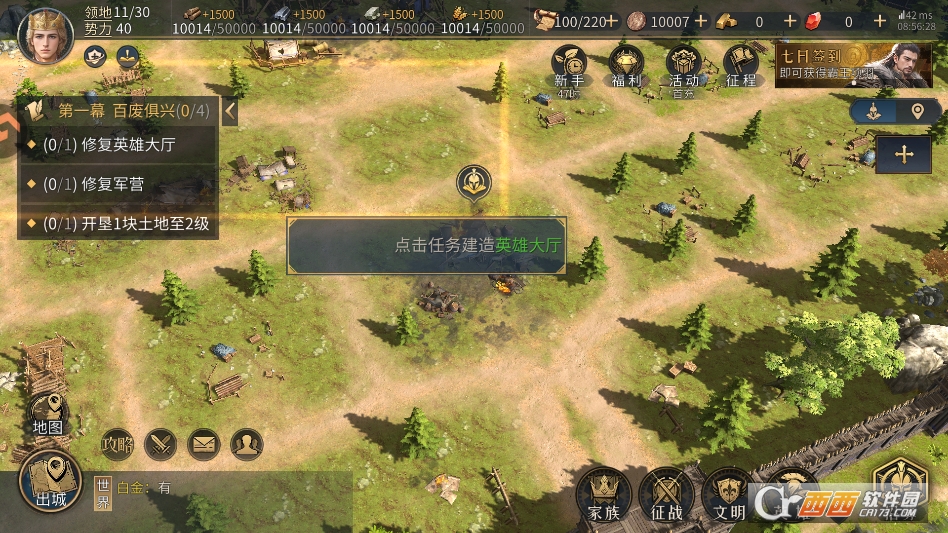 6、持续做主线任务和打地。在大约2小时的时候,队伍的体力、兵力基本耗尽,此时任务差不多到了“升级城镇中心到7级”,就可以下线休息了,休息前尽可能预留一些体力,把一块内城石料资源地开垦至7级,并强征补足资源。