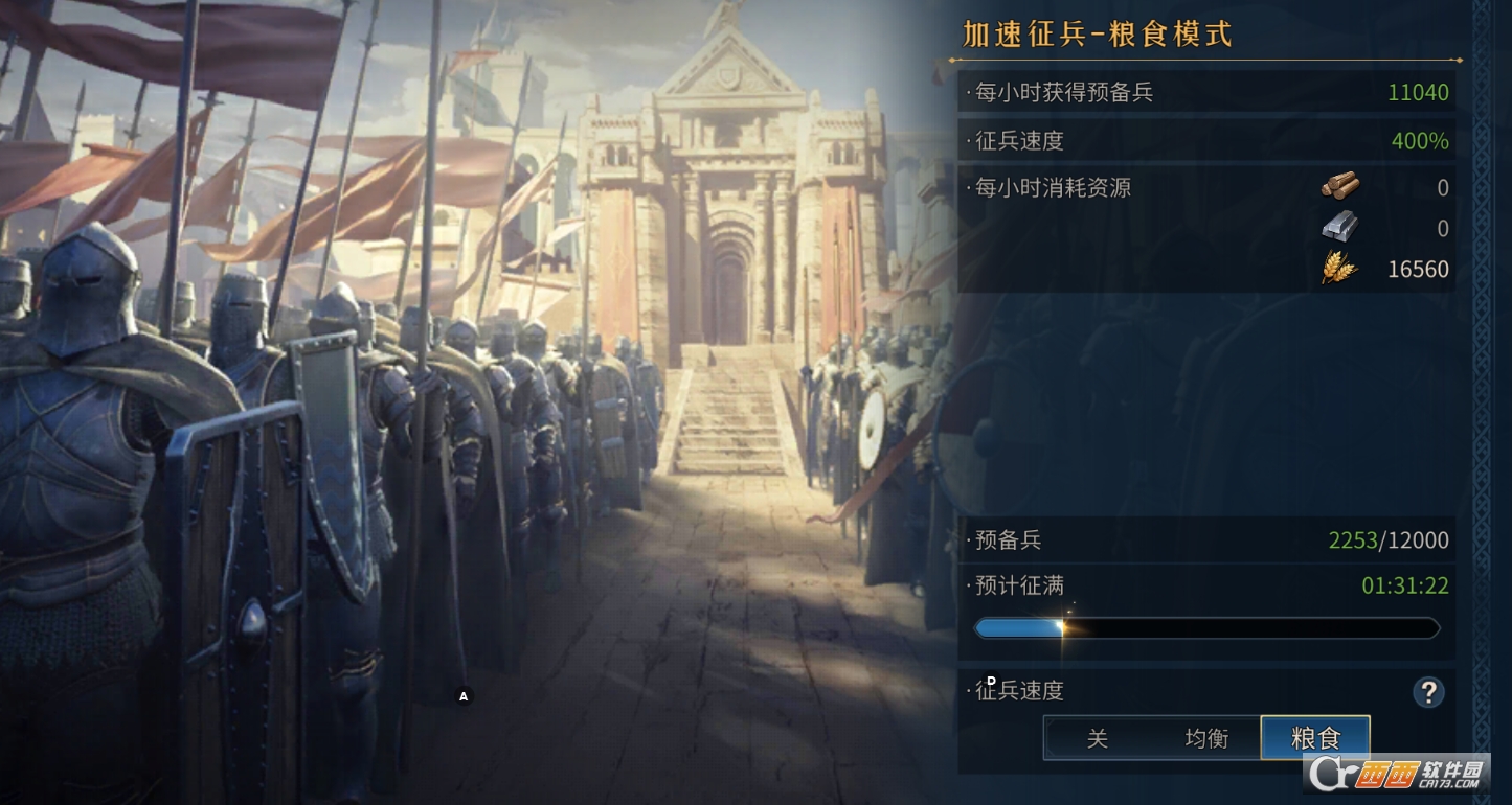 4、在募兵所打开粮食加速来加快征兵速度,通过任务获得的面包(恢复体力道具)喂给桃园队。