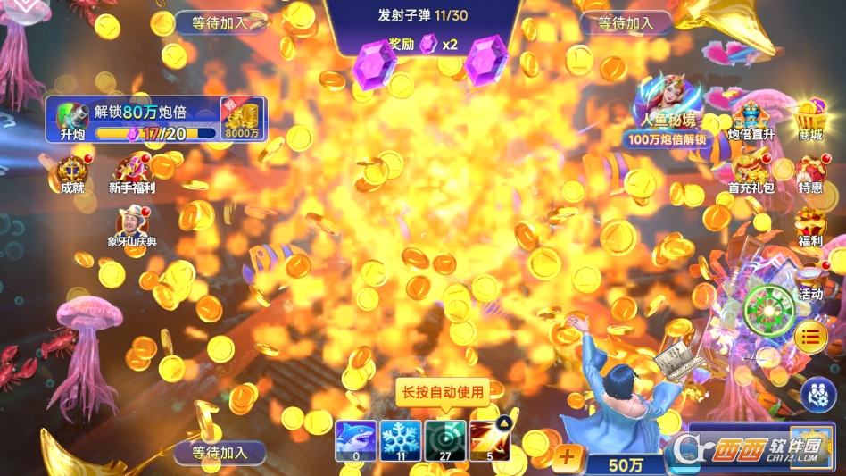 1. 经典街机捕鱼玩法,完美还原电玩城捕鱼机的核心体验,玩家操控炮台发射炮弹,瞄准海底鱼群和BOSS进行捕获,捕获鱼群就能获得金币奖励,鱼种倍率越高、BOSS等级越高,奖励越丰厚。