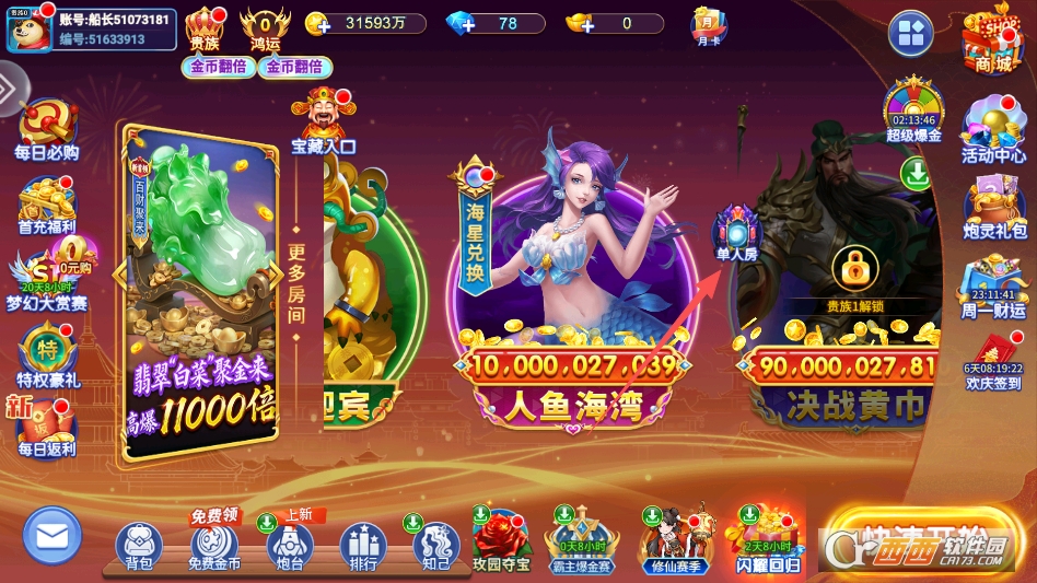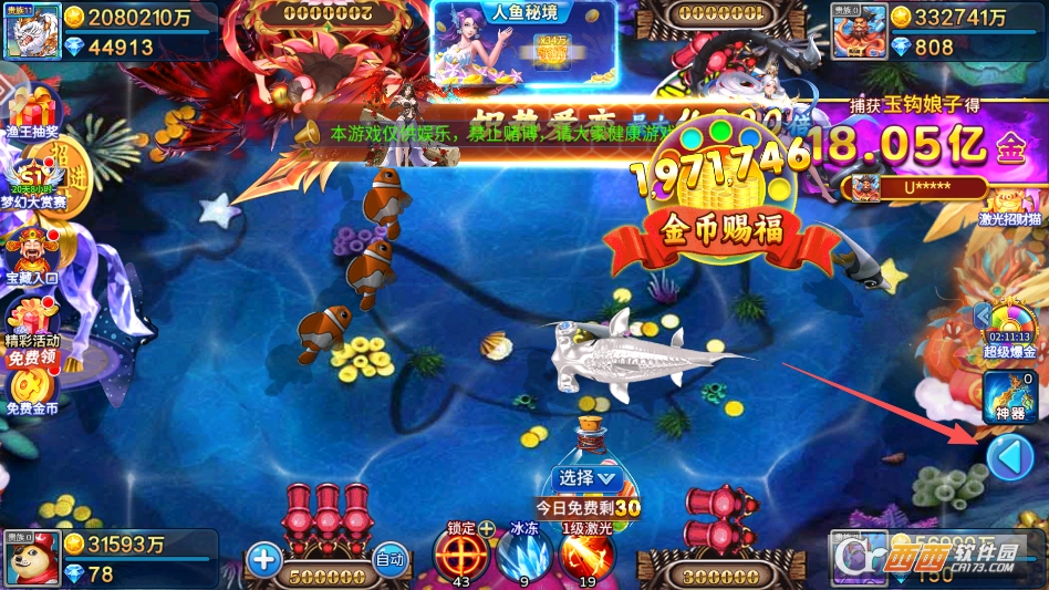 炮台最高上限达到9900.这是它的一大亮点,炮台等级越高,威力越强、射程越远,捕获大鱼和BOSS的几率也大幅提升,让玩家享受一炮爆金、全屏捕鱼的畅快体验,玩起来特别过瘾。