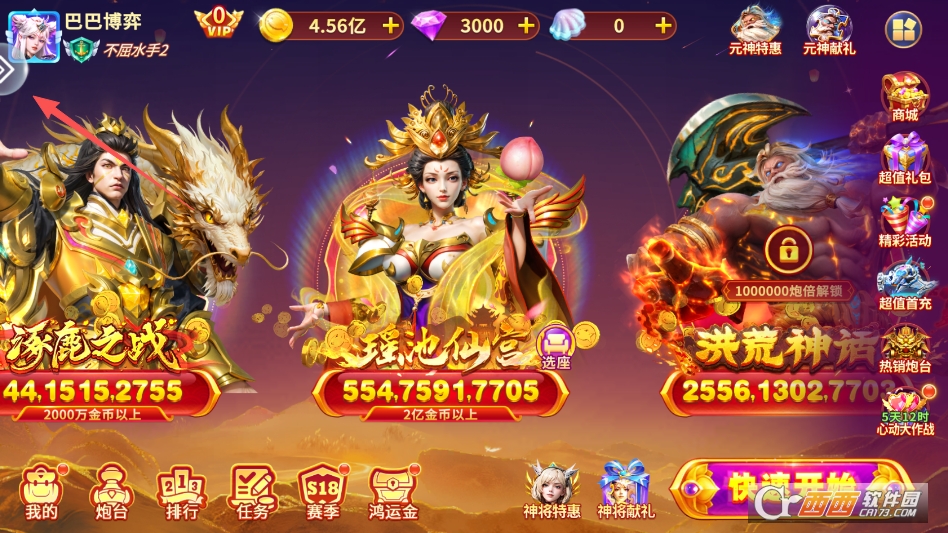 赛场切换玩法也是核心之一,玩家可根据自己的喜好,自由切换不同背景的赛场,每个赛场的鱼种分布、特效的不同,需要调整捕鱼策略,搭配不同的炮台和道具,才能获得更高收益。