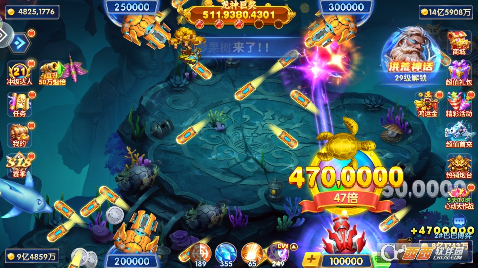 4. BOSS挑战玩法,游戏内定时刷新多种特色海底BOSS,每种BOSS都有独特的技能和高额奖励,玩家可以独自挑战,也能组队围攻,击败BOSS就能获得大量金币、道具和倍率加成。