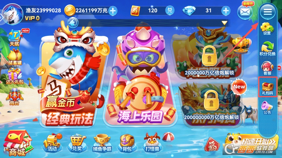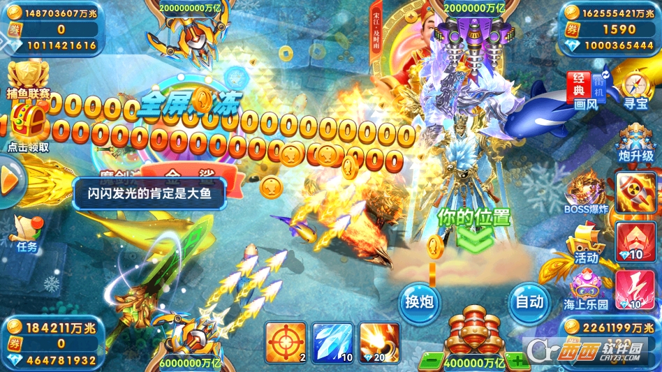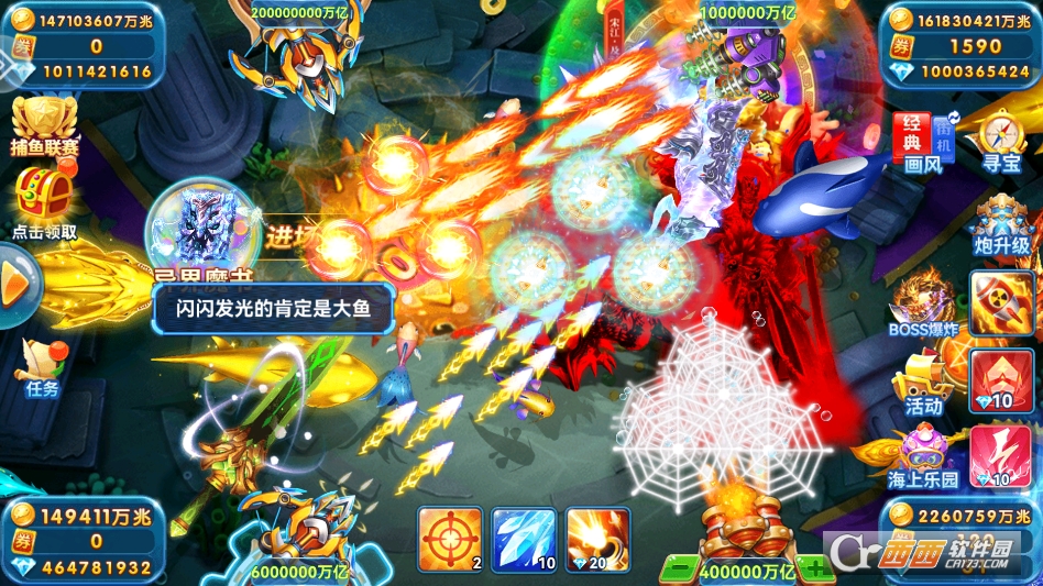 新增多款炫酷炮台和专属技能,优化了炮台外观和特效,新增万倍高倍率炮台,解锁后一炮爆金的收益翻倍,部分炮台新增连锁爆炸、激光锁定等专属技能,大幅提升捕鱼效率,爽感升级。
