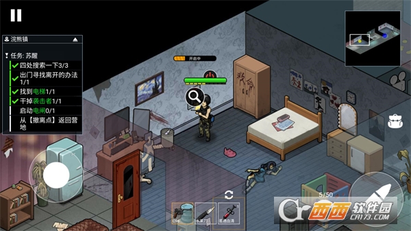3、进入关卡后左边控制角色的移动,右边是换弹、射击和背包按钮,屏幕下方的是你的武器和治疗道具,右上角的是关卡地图,左上方的是你的任务。