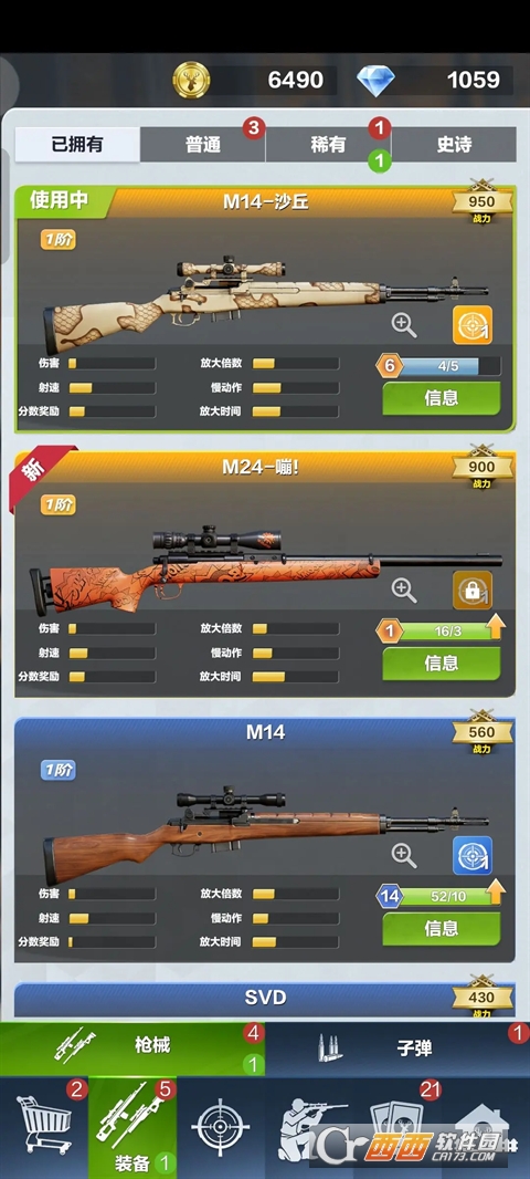 分为枪械和子弹界面,这里能够查看枪械和子弹的具体信息以及获取条件,后续的保养升级都在此处。