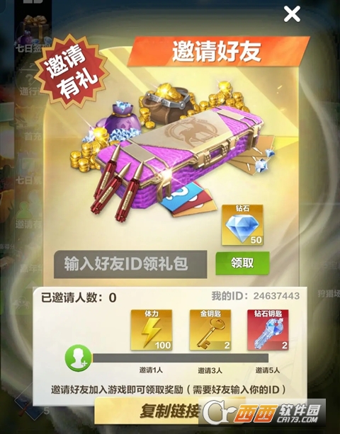 复制链接邀请好友加入游戏即可领取钻石、体力、宝箱钥匙等奖励,最多可邀请5人,赶紧呼朋唤友加入游戏领取奖励吧~