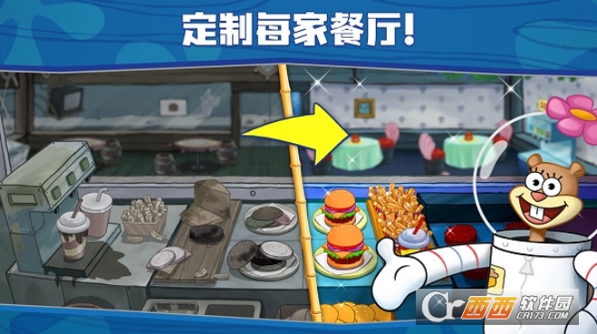 餐厅升级与定制:用经营所得金币或钻石升级煎锅、咖啡机等厨房工具,减少烹饪时间、提升工具容量来提高效率;还能自由搭配各类风格的家具与装潢,随心定制专属蟹堡王餐厅的外观,打造独一无的海底餐厅。
