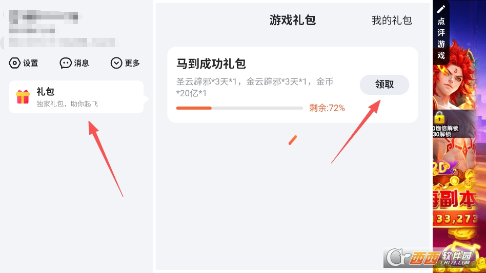 呼出系统菜单,点击礼包版块,即可查看到当前可以领取的礼包福利