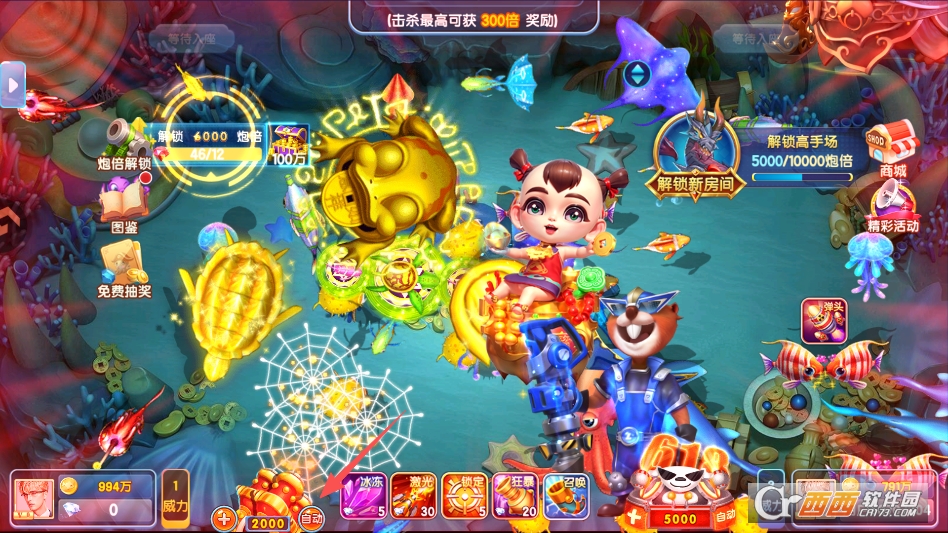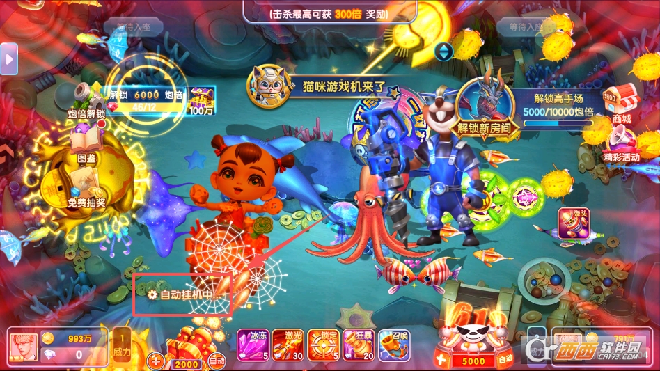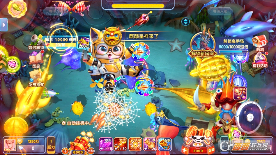 利用免费升级的高阶炮台,射程与威力更强,打鱼更轻松。