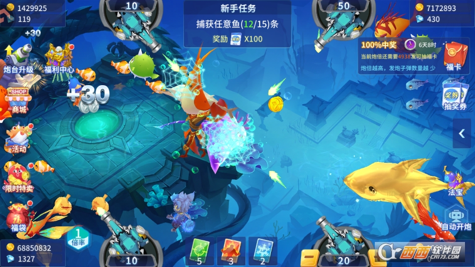 特色BOSS挑战玩法定时开启,超大体型的海底BOSS登场时会有提示,捕获BOSS就能获得海量金币和稀有炮台,乐趣翻倍。
