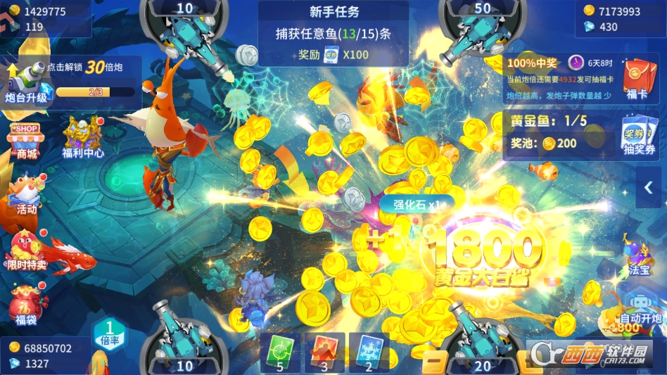 超高爆率是这款游戏的核心亮点,日常捕鱼就能轻松触发高倍暴击,一炮打出千万金币的目标轻松达成,玩起来格外爽快。游戏内福利活动数量充足且领取便捷,不用复杂操作,登录和游玩过程中就能自动解锁,让玩家全程都能享受福利加持的快乐。