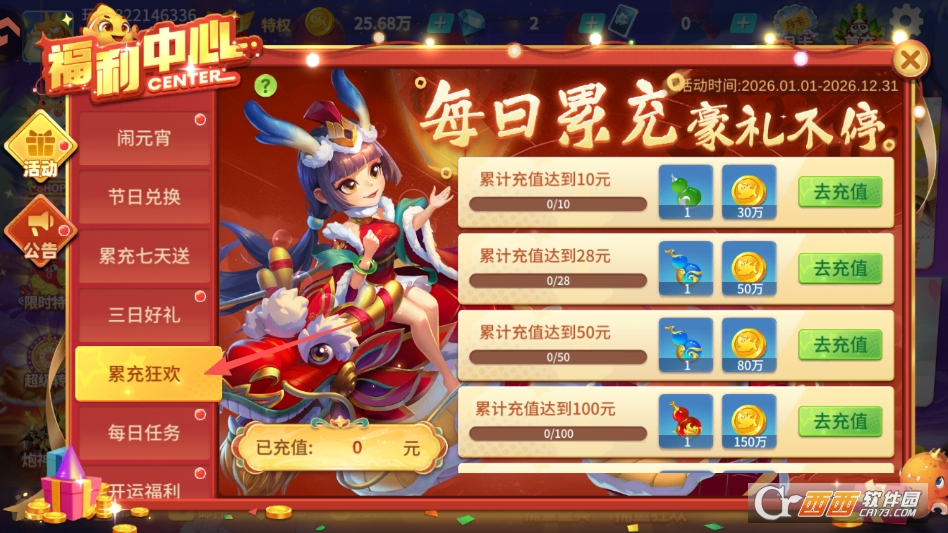 打开福利专区,找到累充奖励页面,即可领取对应奖励