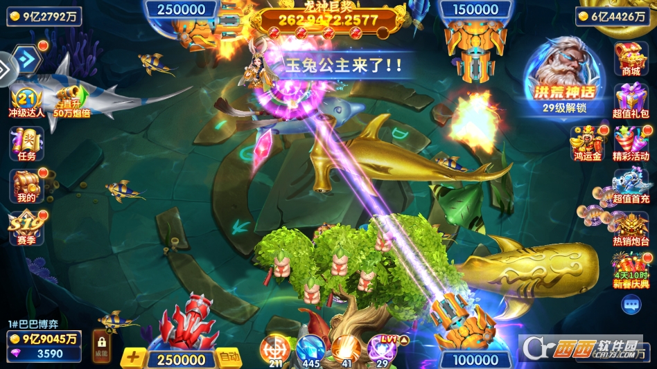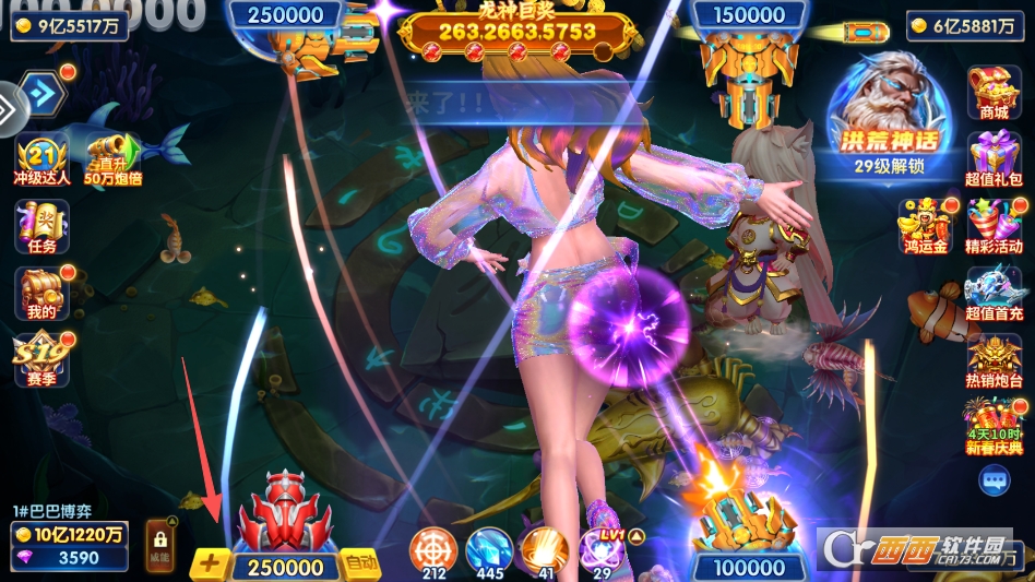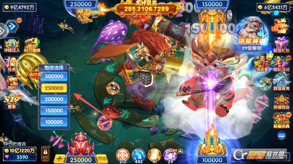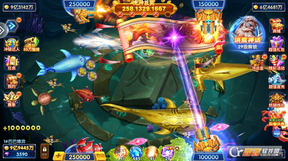 炮台系统丰富多样,支持多档位倍率自由切换,从基础倍率到万倍倍率逐步解锁,炮台级别越大,发射的光球射程越远,爆裂面积越大,越容易击中鱼群,玩家可根据自身资源与鱼群情况灵活调节,低倍率适合稳定收割小鱼,高倍率用于冲击高倍鱼与强力BOSS,提升收益上限。