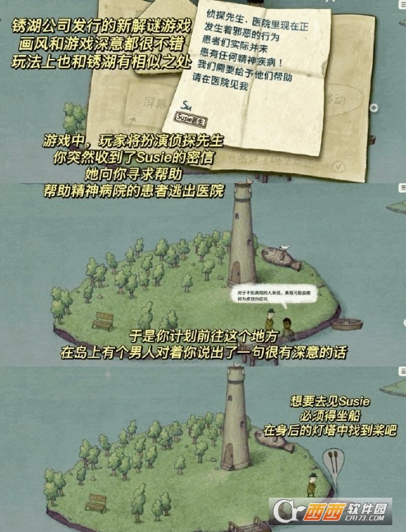 1、游戏中,玩家将扮演侦探先生,你突然收到了Susie的密信,她向你寻求帮助,帮助精神病院的患者逃出医院,对于不知离期的人来说,真格可彩会被,于是你计划前往这个地方,在岛上有个男人对着你说出了一句很有深意的话,想要去见Susie,必须得坐船,在身后的灯塔中找到桨吧。