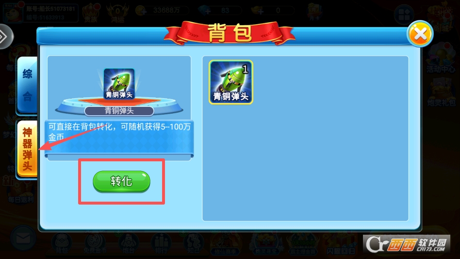 打开背包,找到你的弹头,点击转换即可转换成金币