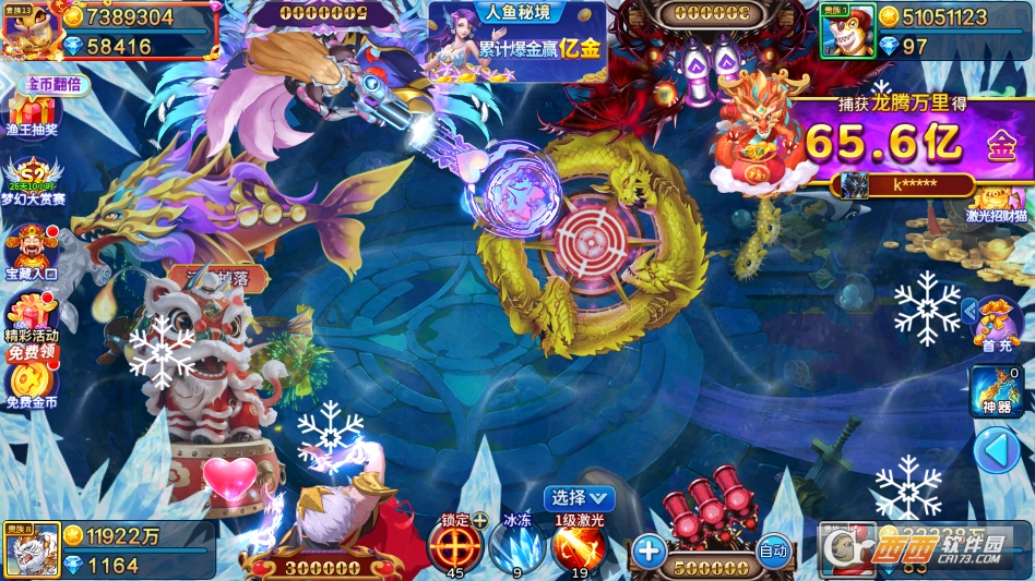 冰冻道具可冻结全屏鱼群3-5秒,减缓鱼群游动速度,无论是应对密集鱼群还是快速游动的BOSS,都能发挥重要作用,冻结后鱼群无法移动,玩家可集中火力扫射,轻松实现一炮多金,尤其适合鱼群浪潮出现时使用,收益翻倍。