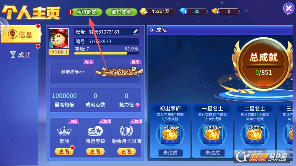 进入游戏后点击左上角头像打开个人中心,然后点击上方的绑定手机选项