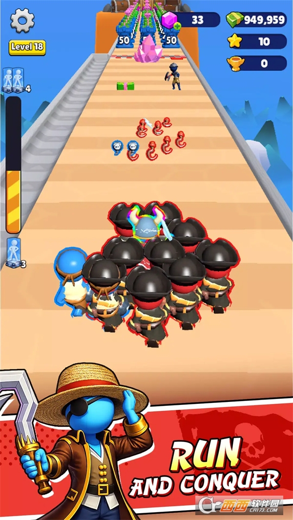 人群集结与养成:玩家在跑酷赛道中,通过收集沿途的单位图标,不断扩大自己的人群规模,人群数量越多,战斗力与突破能力越强,同时可对人群进行升级,解锁不同时代的专属技能,比如远古时代的野蛮冲击、未来时代的激光扫射等,提升闯关效率。