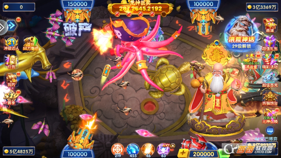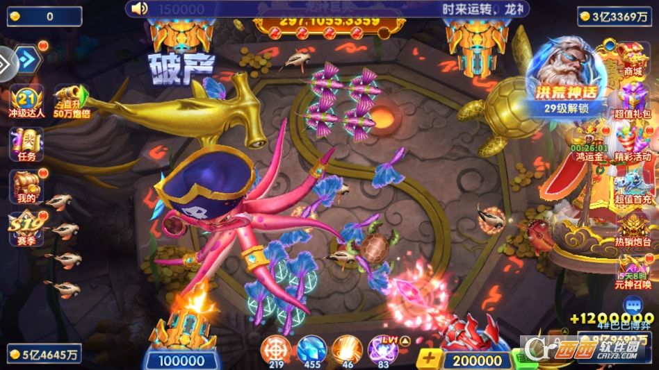经典千炮炮台自由升级,倍率灵活切换,搭配强力道具,捕捞体验爽快刺激。
