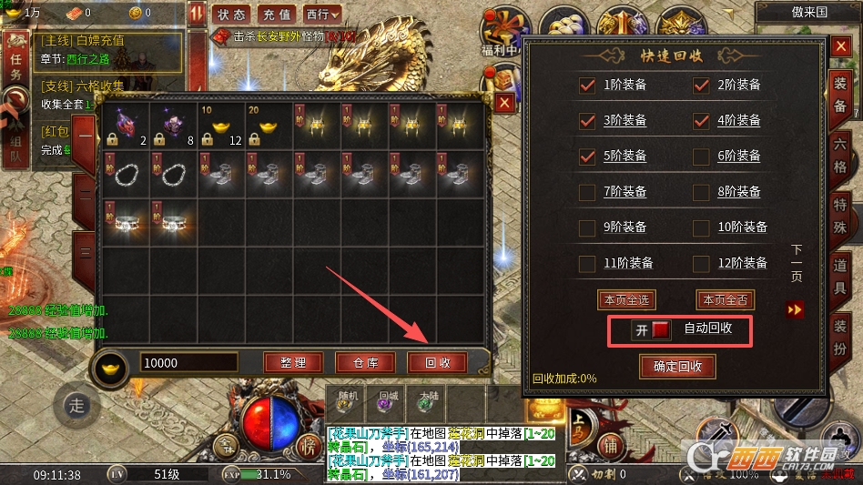 打开背包后点击回收选项,呼出回收菜单,开启自动回收功能即可
