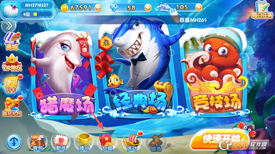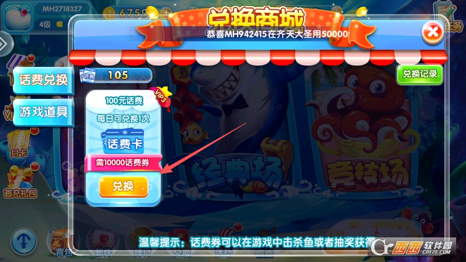 在渔场中打到话费券之后,点击主界面下方的兑换按钮