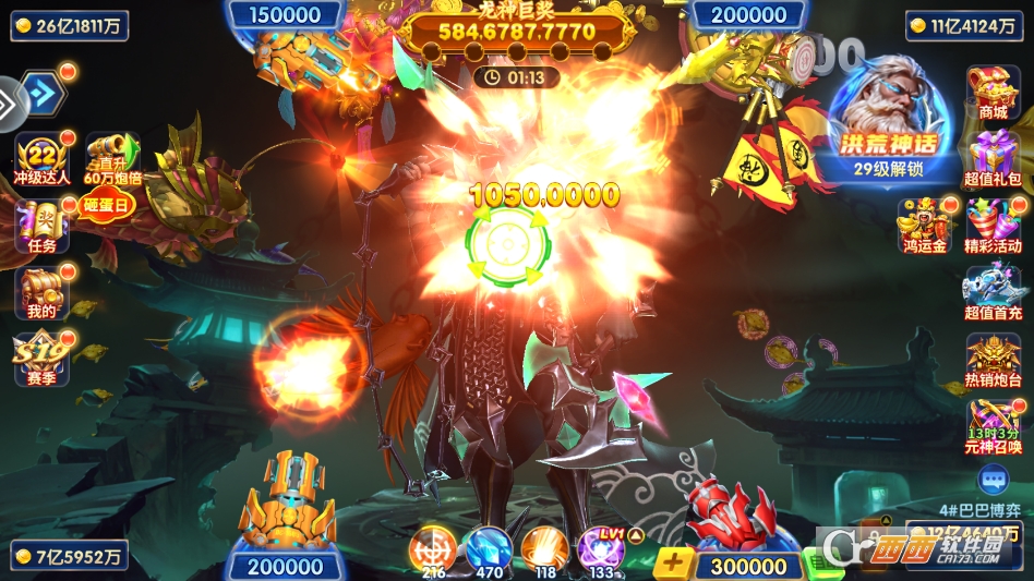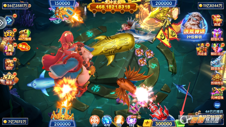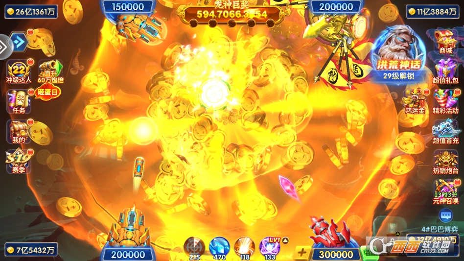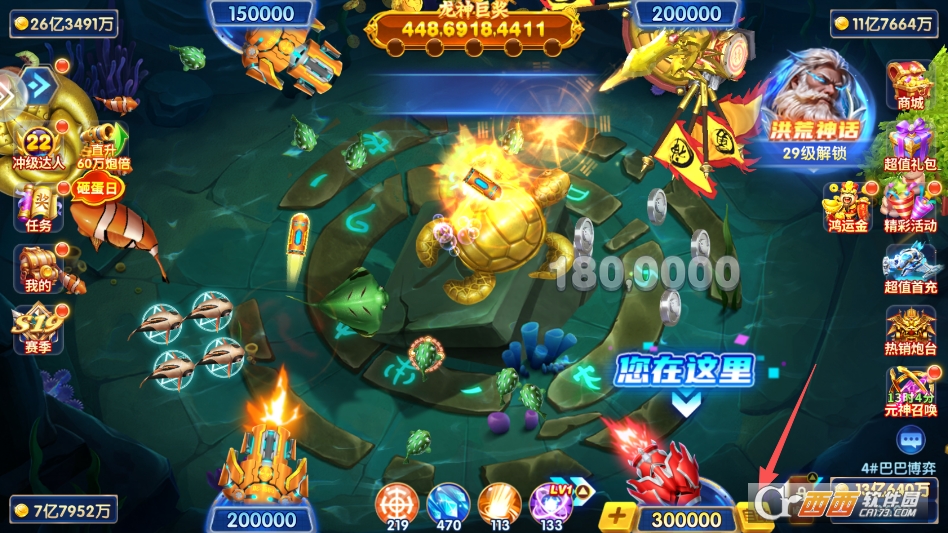 2. BOSS围捕玩法:定期刷新黄金鲨、钢甲龙、远古暝兽等强力BOSS,BOSS体型庞大、奖励丰厚,捕获后可获得大量金币、钻石与炮台升级材料,支持单人挑战或组队围捕,合力击败BOSS可触发连锁爆金,解锁额外大奖。