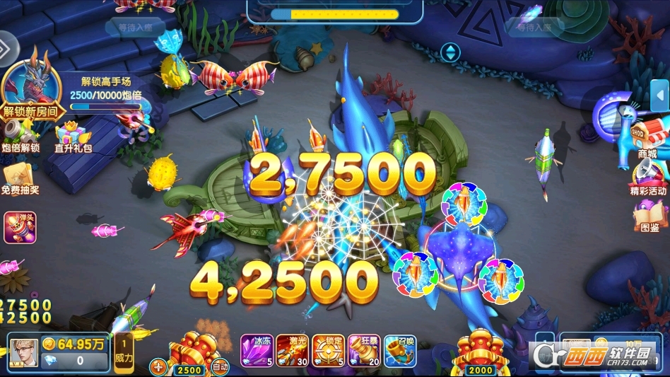 经典捕鱼模式为核心,内置多梯度渔场,玩家可选择不同倍率炮台,瞄准鱼群与BOSS发射炮弹,捕获后获取金币、钻石、道具,还可解锁更高阶炮台与技能。