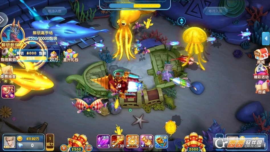 采用最新3D引擎技术制作,画面质感媲美3A大作,海底场景色彩丰富、细节逼真,鱼类游动姿态鲜活灵动,技能光效与爆金动画炸裂震撼。