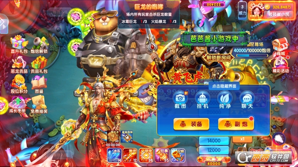 鱼丸捕鱼大作战3D手机版除经典捕鱼模式外,还设计多款特色特殊模式,覆盖休闲、竞技、挑战、福利等多元需求,每款模式都有独特玩法与奖励机制。BOSS挑战模式为核心特色模式,固定时间段刷新海盗船、远古巨鲨、平天大圣、天贵星米诺斯、烈焰龙马等强力BOSS,部分BOSS拥有独特技能机制,需搭配神兵、道具瞄准弱点攻击,击杀后可掉落巨额金币、稀有弹头、幻神碎片、话费碎片等丰厚奖励,全服玩家还可协作挑战世界BOSS,共享高额奖励。