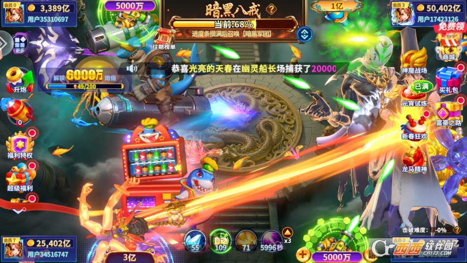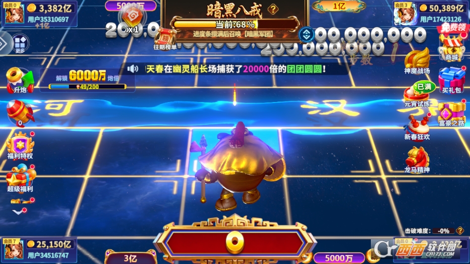 超高爆率机制,渔场与爆率同步升级,打哪爆哪,普通鱼群捕获概率高,BOSS掉落巨额金币与稀有道具的几率大幅提升,“一炮亿金”不再是梦想。