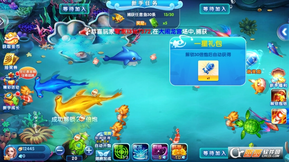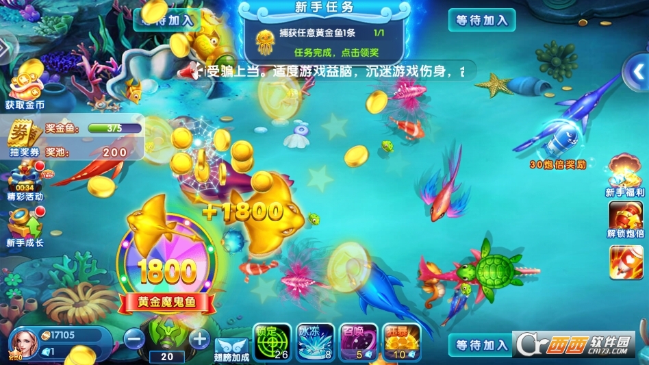 1. 核心捕鱼玩法:玩家操控炮台,滑动屏幕调整射击角度,点击屏幕发射炮弹,炮弹命中鱼类即可捕获并获得对应金币奖励,鱼类倍率越高,获得的金币越多;捕获特殊鱼类(如炸弹鱼、冰冻鱼)可触发范围伤害、冻结鱼群等特效,提升捕鱼效率。