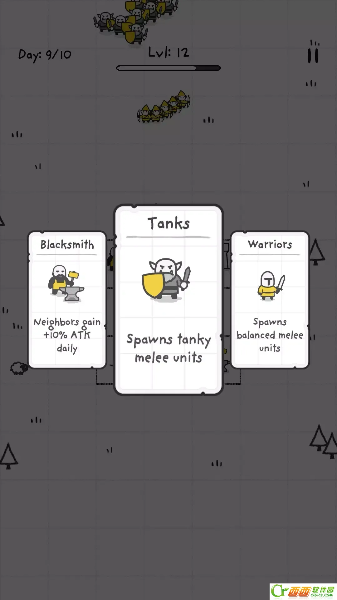 2. 有独特的三选一升级系统,每波敌人后可从三张卡牌选一张强化或解锁新单位。
