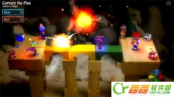 3、以大乱斗扔炸弹为主,可选择角色最多4v4对战,地图虽小但乐趣十足,能举对手或炸弹,道具随机刷新。