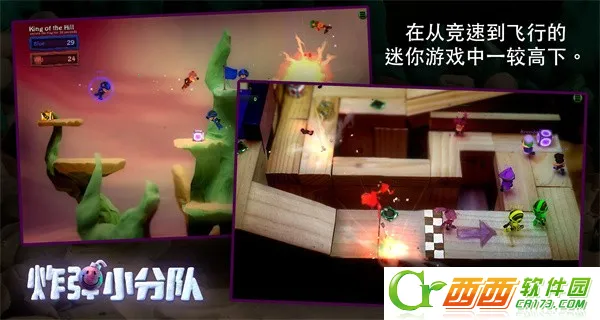 1.画面精美:采用清新卡通画风,人物是呆头呆脑胳膊腿乱甩的3D小人,场景刻画精细,背景细节与人物绘画水平高,动作细节夸张又无违和感,经特殊渲染和移轴处理,像微缩积木和橡皮泥,物理效果棒,爆炸烟尘逼真。