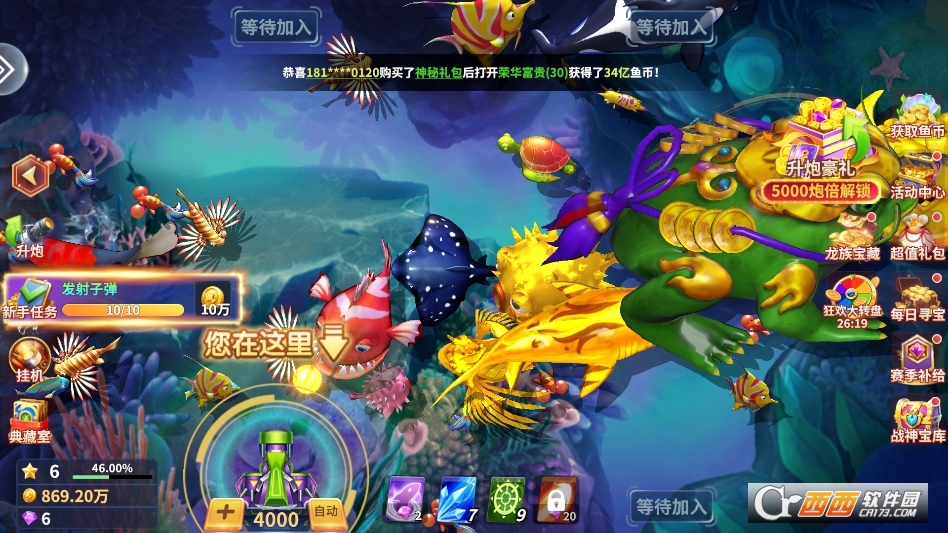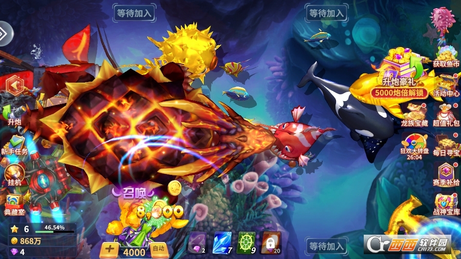 新增特色玩法与内容,新增1款佛系挂机专属炮台,无需手动操作,开启后自动瞄准鱼群、持续发射炮弹,智能切换倍率,解放双手,适配碎片化时间;新增2种稀有鱼种,捕获后可触发额外金币奖励,同时优化五大BOSS的技能特效与掉落概率,击败BOSS后可额外获得百万金币暴击机会。
