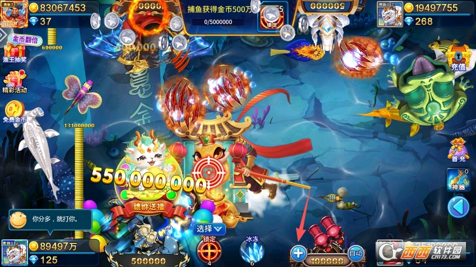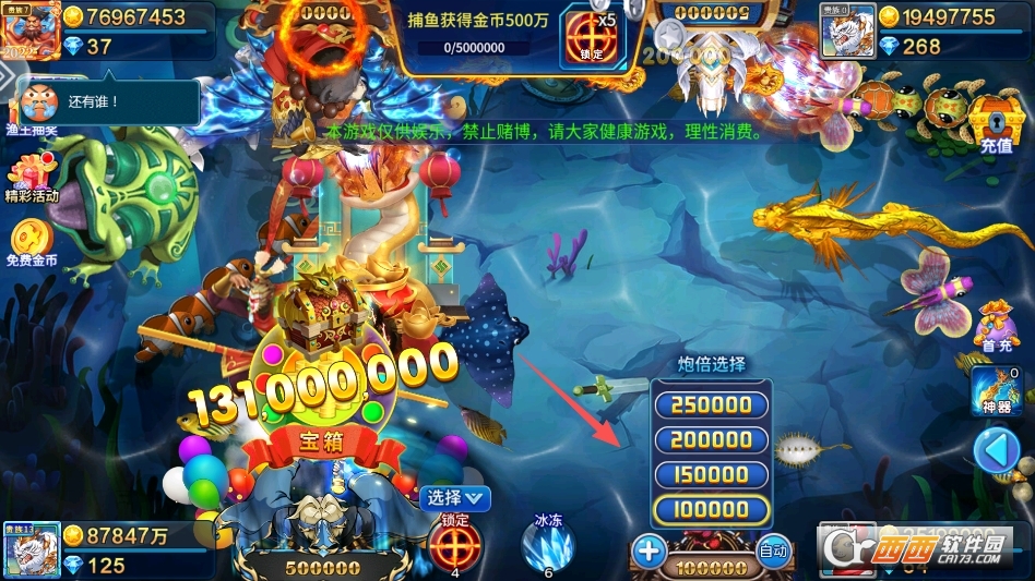 其次,操作极简易懂,新手进入游戏后有清晰的新手引导,全程手把手教学,只需滑动屏幕调整炮台角度,点击屏幕即可发射炮弹,左侧可自由切换炮台倍率,核心操作仅两步,无需学习复杂的技巧与规则,即便老人小孩也能轻松掌握。