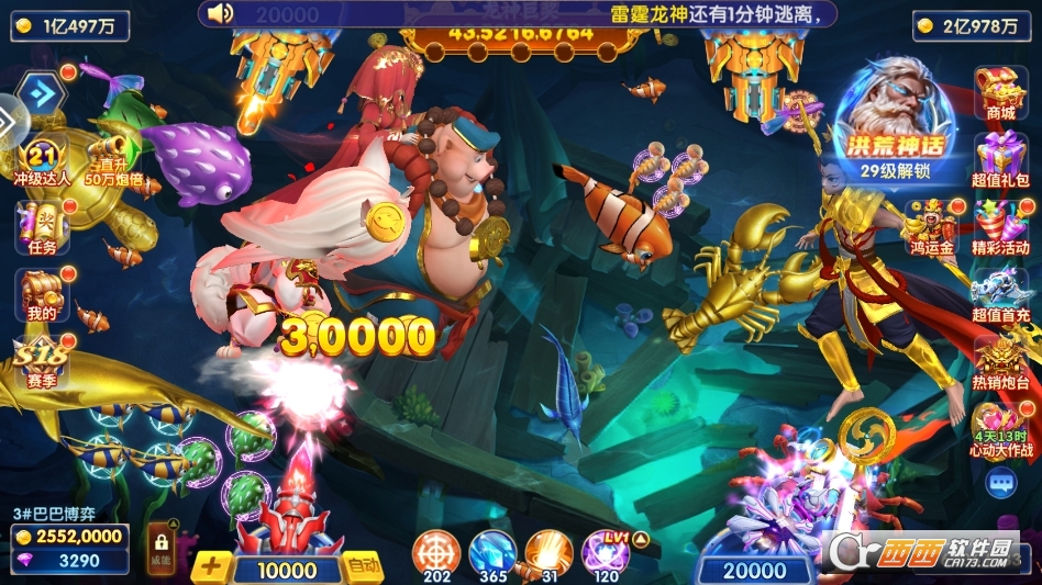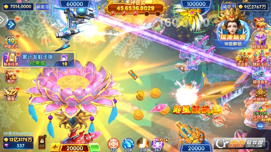 亿级金币福利体系:内置海量亿级金币供玩家使用,每日登录、完成任务、参与活动、邀请好友均可领取金币,零氪玩家也能稳定积累财富,无需担心资源不足,高倍率炮台捕获珍稀鱼类与BOSS时可获得巨额金币奖励,满屏爆金特效带来直观财富积累快感。